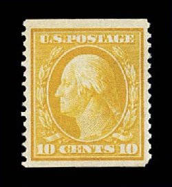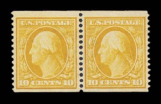 315 og 356 image#356, 10c Yellow coil, perf. 12 vert., an extraordinarily handsome mint pair of this important coil rarity, possessing a marvelous overall brilliance and freshness which separates it from most other pairs one sees, with spectacularly intense color in a much deeper shade than usual, plus it boasts exceptional centering within uncharacteristically wide margins, full o.g., relatively lightly hinged, extremely fine; few Ten Cent 1909 Coils exist in this premium condition; 1956 and 1988 PF certificates; ex-Engel. (Image) $6,750.00