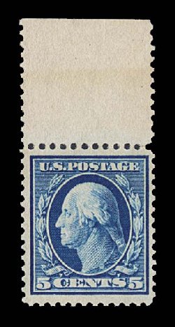 320 og 361 image#361, 5c Blue on bluish paper, an exceedingly handsome top sheet-margin mint example of this very rare stamp, featuring prooflike color and impression, particularly well centered and margined, full clean o.g., lightly hinged, very fine; a choice and eye-appealing copy of the Five Cent Bluish Paper; 1983 PF certificate. (Image) $5,000.00