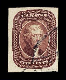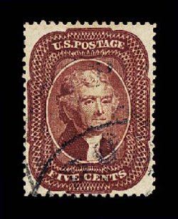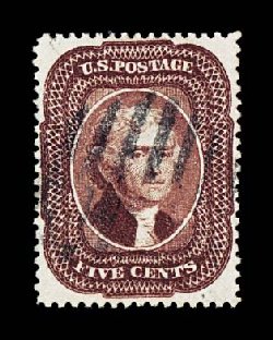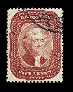 38 O 28A image#28A, 5c Indian red, Ty. I, an exceedingly handsome used example, possessing far better centering and much larger margins than typically associated with this rare and challenging stamp, with all of its perforations clear of the design projections, in addition possessing marvelously rich and unmistakable Indian red color, highly detailed impression on bright paper, neatly and unobtrusively cancelled with portions of black c.d.s., extremely fine; 1995 PF certificate. (Image) $3,250.00