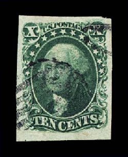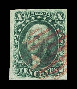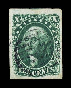 22 O 13 image#13, 10c Green, Ty. I, a beautiful used example of this scarce type, with four large and well balanced margins, rich luxuriant color and impression on bright paper, all wonderfully complemented by a striking red rimless grid cancel, extremely fine; a stamp with great eye appeal; 1993 PF certificate. (Image) $925.00