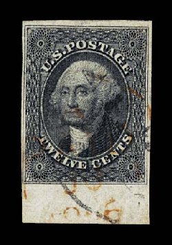 26 O 17 image#17, 12c Black, a highly desirable used single, with mostly large margins all around including an impressive 6mm bottom sheet margin, deep intense color and a prooflike impression on fresh paper, lightly cancelled by both a black and an orange c.d.s. postmark, an extremely fine stamp with great eye-appeal; 1984 and 2002 PF certificates. (Image) $370.00+