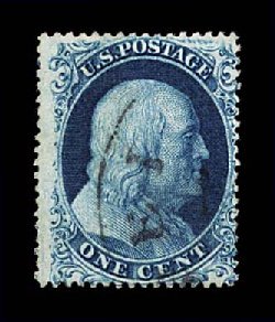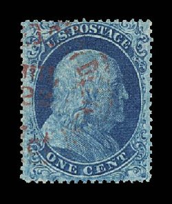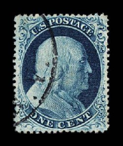 27 O 18 image#18, 1c Blue, Ty. I, an exceptionally choice and attractive used example, being wonderfully well centered within large margins, bright characteristic Ty. I color and impression on immaculate paper, light strike of a red New York Carrier c.d.s. cancel, extremely fine; an especially elusive stamp in this premium condition; 1979 PF certificate. (Image) $735.00