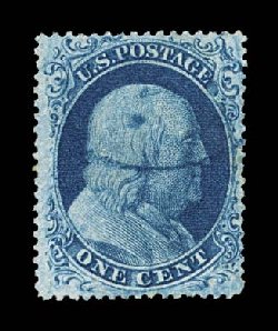 28 O 19 image#19, 1c Blue, Ty. Ia, position 92L4, a wonderfully choice used example of this rare and enormously challenging stamp to find in any kind of collectable quality, featuring an overall freshness seldom encountered, with strikingly intense color and a prooflike impression on immaculately white paper, while not perfectly centered, this stamp possesses far better centering than usual, and is positioned between the perforations so that the all important Ty. Ia characteristics show definitively, very light and unobtrusive town c.d.s., very fine for this; 1990 PSE certificate. (Image) $8,000.00