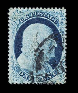 31 O 22 image#22, 1c Blue, Ty. IIIa, used, virtually perfectly centered within uncharacteristically large margins, deep luxuriant color and impression, light strike of face-free town c.d.s., extremely fine; 2001 PF certificate. (Image) $550.00