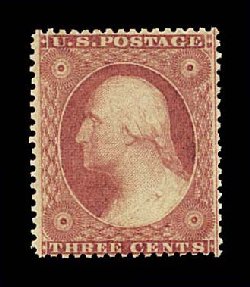 34 og 25 image#25, 3c Rose, Ty. I, a remarkable mint example of this terribly difficult and rare stamp, possessing nearly flawless centering for this, with deep luxuriant color and an excellent clarity of impression seldom seen, full clean o.g., lightly hinged, extremely fine; the rarity of this stamp in this outstanding quality cannot be overstated, as the Type I plate simply did not leave enough room for perforating stamps without the perforations impinging the design nearly all around, any example which shows all four frame lines is exceedingly rare, and such well centered examples that are also sound and possess original gum are next to impossible to find; 1980 PF certificate; ex-Lutwak. (Image) $2,750.00