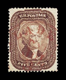 36 O 27 image#27, 5c Brick red, Ty. I, a most extraordinary quality used example, being incredibly well centered amid lavishly large margins, with its perforations well clear of the design projections all around, which is a rare occurence on this notoriously difficult stamp, additionally it boasts gorgeous brick red color in the deepest shade we have ever encountered, and its impression is quite strong on bright fresh paper, light face-free town c.d.s. confined to top right corner, extremely fine gem; a true condition rarity; 1995 PF certificate. (Image) $1,600.00