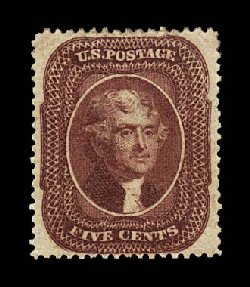 40 og 30 image#30, 5c Orange brown, Ty. II, brilliantly fresh mint example, sumptuously rich color and impression on crisp paper, unusually well centered with the design clear of its perforations all around, full o.g., very fine and quite choice; photocopy of a 1989 PF certificate. (Image) $1,250.00