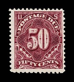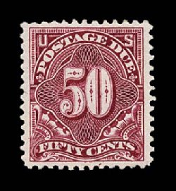 496 og J50 image#J50, 50c Deep claret, handsome and fresh mint single of this rare postage due, well centered within especially wide margins, rich vibrant color, o.g., lightly hinged, choice very fine; an attractive example of this high value; 1988 PF certificate. (Image) $1,100.00
