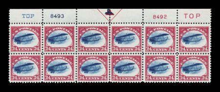 281 ogPB C3 image#C3, 24c Carmine rose and blue, full top margin arrow, double "TOP" and plate nos. 8493, 8492 block of twelve, being in exceptional condition when compared to most, marvelously well centered and margined throughout, brilliantly fresh colors, strong and intact, even the strong shift of the central blue vignette contributes to this plate's overall eye appeal, o.g., top right corner stamp with faint trace of a hinge mark, rest n.h., extremely fine. (Image) $1,225.00