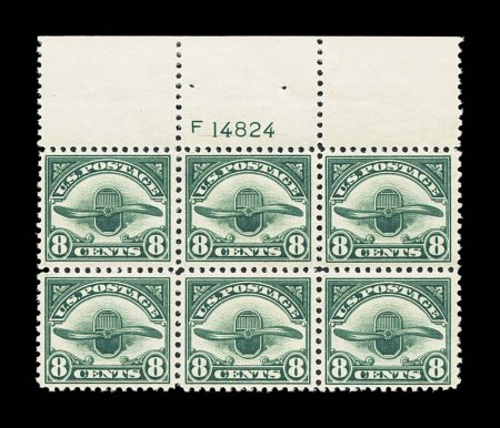 282 nhPB C4 image#C4, 8c Green, full top margin plate no. F 14824 block of six, exceptionally bright and fresh, strong rich color, well centered, o.g., n.h., couple of very mild natural gum bends, extremely fine. (Image) $325.00