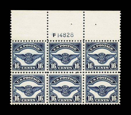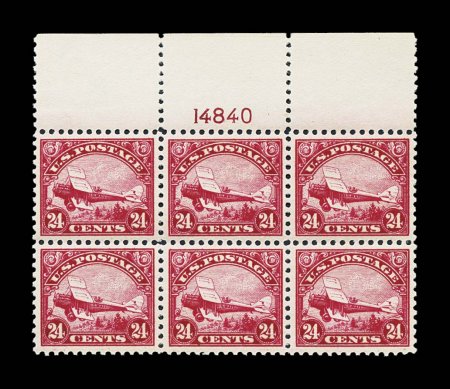 284 ogPB C6 image#C6, 24c Carmine, gem full top margin plate no. 14840 block of six, possessing absolutely gorgeous centering and margins throughout, plus its color could not be more intense, nor its impression more deeply etched on brilliantly fresh paper, o.g., four stamps n.h., two right stamps with just the barest suggestion of a hinge mark (if at all), extremely fine; easily one of the most impressive full top examples of this air post plate block we have ever seen. (Image) $2,050.00