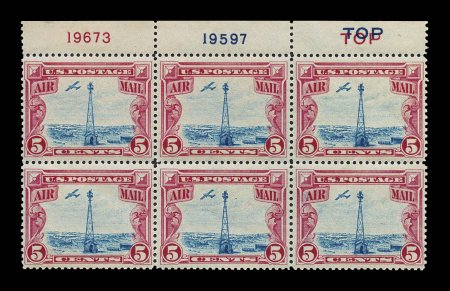 285 nhPB C11 image#C11, 5c Carmine and blue, full top margin double "TOP" and plate nos. 19673, 19597 block of six, quite fresh and crisp, rich colors, well centered, o.g., n.h., a very fine example of this scarce configuration air post plate block. (Image) $150.00