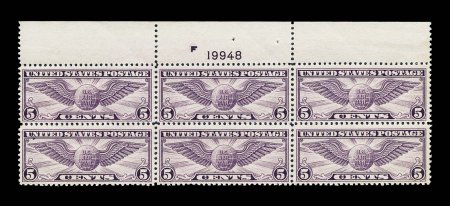 286 nhPB C12 image#C12, 5c Violet, full top margin plate no. F 19948 block of six, exceptionally well centered, deep rich color, o.g., n.h., extremely fine; surprisingly difficult to find as a premium quality full top plate block. (Image) $200.00