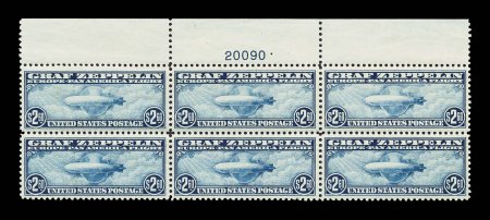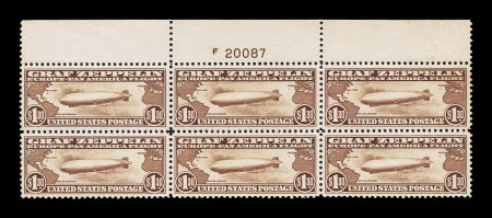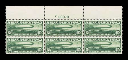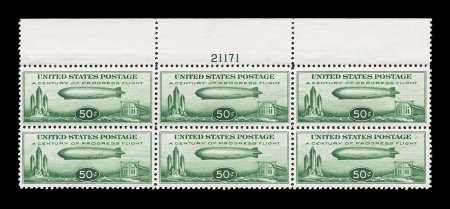 289 nhPB C18 image#C18, 50c Graf Zeppelin, full top margin plate no. 21171 block of six, each stamp within the plate being exceptionally well centered within large margins, bright color, o.g., n.h., some minor natural gum skips and bends, extremely fine. (Image) $700.00