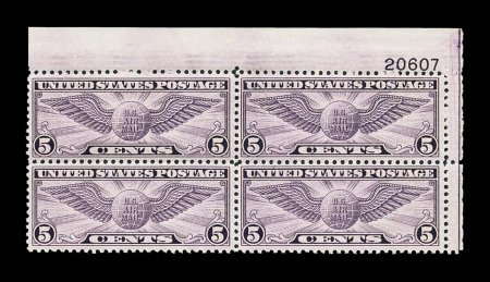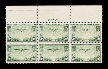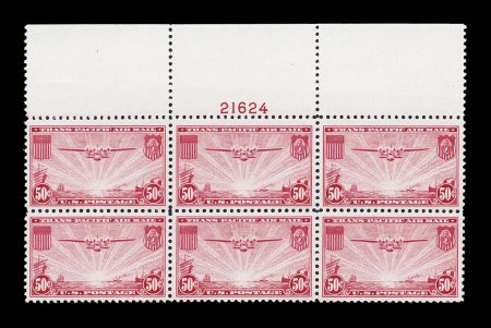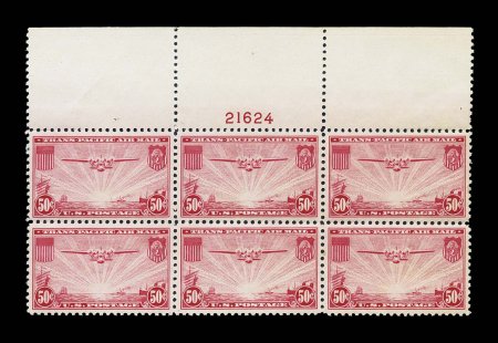 291 nhPB C22 image#C22, 50c Carmine, highly select full top margin plate no. 21624 block of six, surprisingly this is one of the most elusive and rarest plate blocks of the first half of the 20th century to find as a full top position, in fact, while the Scott catalog does not separately price such a plate block they do state that "wide full selvage top margin plate blocks of No. C22 are extremely scarce and sell for six to seven times the value listed ($100.00)", wonderfully fresh, radiant color, well centered, o.g., n.h., just a few natural gum skips, extremely fine. (Image) Est. 500-750