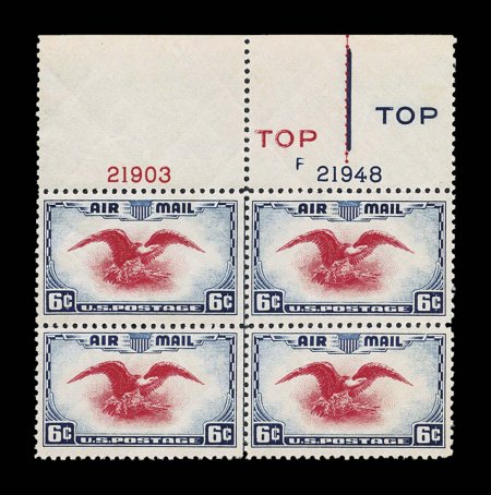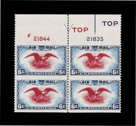 293 nhPB C23a image#C23a, 6c Dark blue and carmine, imperforate horizontally, an impressive full top margin arrow, double "TOP" and plate nos. F 21844, 21835 block of four, containing two error pairs, strikingly intense colors, well centered, o.g., n.h., vertical perforations slightly weak but intact, very fine; only the second example of this error in plate block form we have ever offered. (Image) $1,250.00