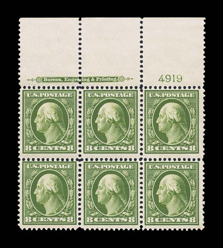 104 nhPB 380 image#380, 8c Olive green, full top margin imprint and plate no. 4919 block of six, quite fresh, deep luxuriant color, o.g., n.h., light natural flat plate gum bend/crease of little importance, nearly very fine for this exceptionally scarce plate block, which is especially elusive as a full top. (Image) $1,875.00