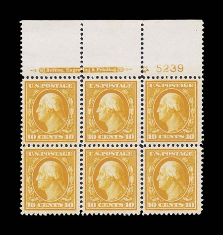 105 ogPB 381 image#381, 10c Yellow, brilliantly fresh and intact full top margin imprint, star and plate no. 5239 block of six, possessing a marvelous overall freshness, with intensely vivid color and a strong impression on immaculate paper, wonderfully well centered and margined throughout, o.g., five stamps n.h., top center stamp lightly hinged, extremely fine; a very scarce plate block with exceptional eye appeal. (Image) $1,250.00
