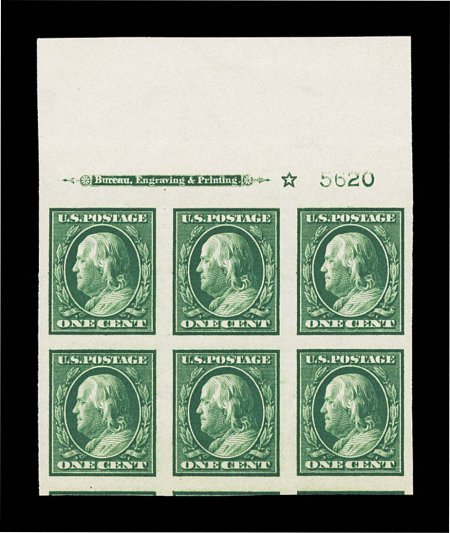 107 nhPB 383 image#383, 1c Green imperforate, gem full top margin imprint, star and plate no. 5620 block of six, lavishly large margins all around, including showing a small portion of three adjoining stamps at bottom, brilliantly fresh, strong rich color, o.g., n.h., extremely fine; a pristine plate block. (Image) $67.50