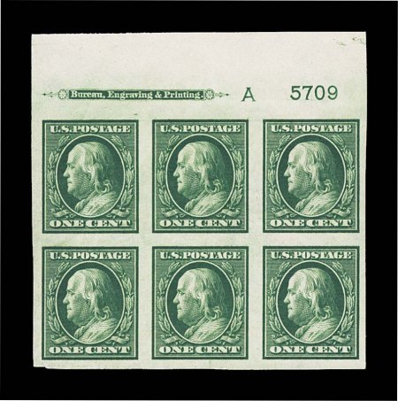 108 nhPB 383 image#383, 1c Green imperforate, full top margin imprint, letter "A" and plate no. 5709 block of six, especially rich color, large margins all around, o.g., n.h., extremely fine. (Image) $125.00
