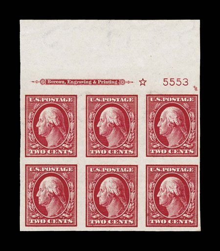 109 nhPB 384 image#384, 2c Carmine imperforate, full top margin imprint, star and plate no. 5553 block of six, large to very large margins, strong rich color and impression on bright paper, o.g., n.h., choice very fine. (Image) $200.00