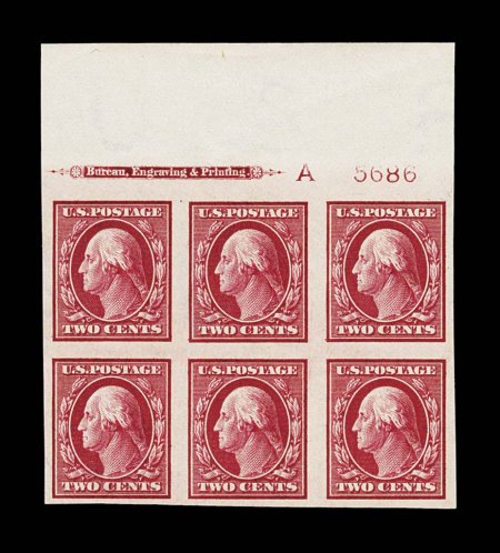 110 nhPB 384 image#384, 2c Carmine imperforate, full top margin imprint, letter "A" and plate no. 5686 block of six, large margins all around, deep "fiery" color and a well incised impression on bright paper, o.g., n.h., extremely fine and quite choice. (Image) $260.00