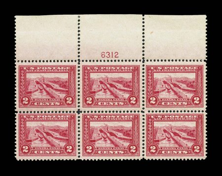 111 ogPB 398 image#398, 2c Panama-Pacific, full top margin plate no. 6312 block of six, unusually bright and fresh, radiant color, extraordinarily well centered for a plate block, pristine o.g., stamps n.h., small hinge sliver at top left in ungummed portion of the sheet selvage reinforcing just a few separated perforations, choice very fine; cataloged as a hinged plate block. (Image) $290.00