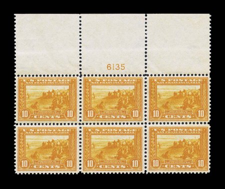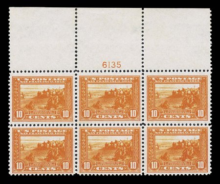 114 ogPB 400A image#400A, 10c Panama-Pacific, a remarkable quality full top margin plate no. 6135 block of six, this being, without question, the rarest and most difficult commemorative plate block of the 20th century, most particularly when one tries to find a full top position example that has not had its selvage reduced, this particular example features a lavishly large sheet selvage, plus it also boasts a marvelous overall brilliance, with deep vibrant color and a well incised impression, extraordinarily well centered and margined throughout, pristine o.g., stamps n.h. (couple with natural gum skips), hinged in the ungummed portion of the sheet selvage, with some sensible reinforcement of a few separated perforations at the top of the sheet selvage, extremely fine overall; the best centered full top example of this plate block to come on the market in years; 1977 PF certificate. (Image) $11,500.00
