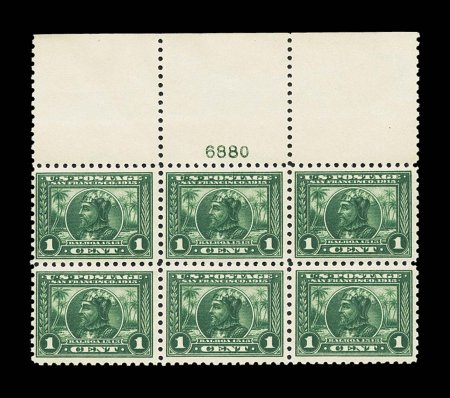 115 nhPB 401 image#401, 1c Panama-Pacific, perf. 10, full top margin plate no. 6880 block of six, extra-wide sheet selvage, quite fresh, strong rich color, nicely centered, o.g., n.h., one stamp with natural gum skips, very fine; a surprisingly elusive plate block as a full top. (Image) $550.00