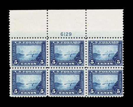 116 ogPB 403 image#403, 5c Panama-Pacific, very scarce full top margin plate no. 6129 block of six, quite fresh and intact, deep rich color and a crisp impression, quite well centered, o.g., five stamps n.h., bottom left stamp with barest trace of hinging, very fine; a terribly elusive plate block in any condition, but particularly so as a full top. (Image) $4,000.00