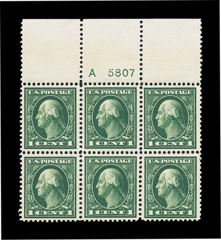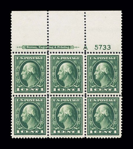 117 ogPB 405 image#405, 1c Green, full top margin imprint, letter "A" and plate no. 5733 block of six, extraordinarily well centered and margined throughout, deep luxuriant color, o.g., four stamps n.h., other two very lightly hinged, extremely fine. (Image) $110.00