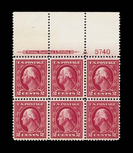 119 ogPB 406 image#406, 2c Carmine, full top margin imprint, letter "A" and plate no. 5740 block of six, strikingly intense color in a deep "fiery" shade, exceptionally well centered, o.g., stamps n.h., barest trace of hinging in selvage, extremely fine and quite handsome. (Image) $130.00