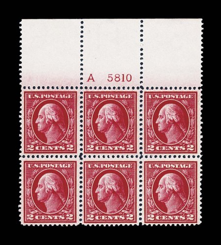 120 nhPB 406 image#406, 2c Carmine, gem full top margin letter "A" and plate no. 5810 block of six, fabulously bright and fresh, with strikingly intense color and impression that would rival any proof, well centered, unblemished o.g., n.h., extremely fine; a surprisingly scarce plate block that possesses tremendous eye appeal. (Image) $210.00