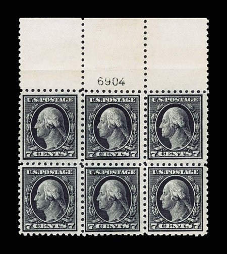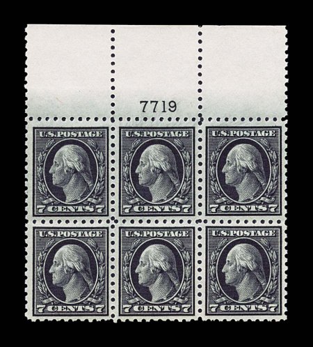 158 nhPB 469 image#469, 7c Black, an extraordinary full top margin plate no. 7719 block of six, one of the most challenging of all Washington-Franklin issues to find as a full top plate block, with this particular example being incredibly choice as well, outstanding centering, deep rich color and a razor-sharp impression, unblemished o.g. without any of the usual gum bends or skips, n.h., extremely fine; we can find no finer full top example in any of the other major plate block auction offerings in the past four decades. (Image) $2,500.00