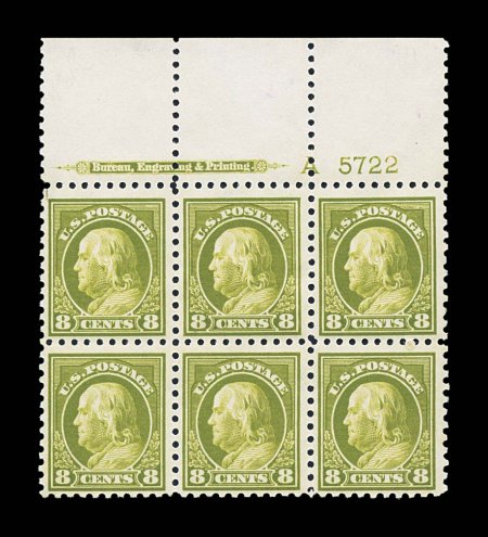143 ogPB 431 image#431, 8c Pale olive green, full top margin imprint, letter "A" and plate no. 5722 block of six, exceptionally well centered, rich luxuriant color, o.g., five stamps n.h., top center stamp lightly hinged, top left stamp with minute marginal tear in corner, otherwise choice very fine. (Image) $450.00