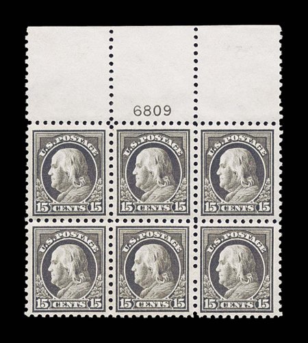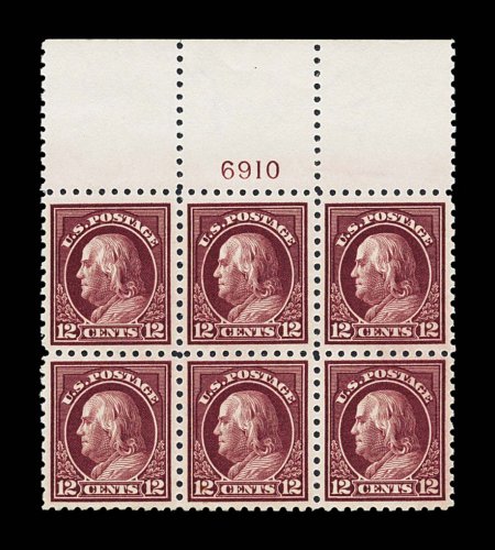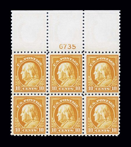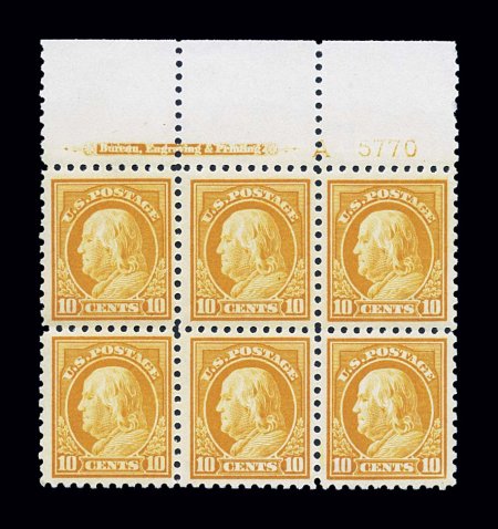145 nhPB 433 image#433, 10c Orange yellow, choice full top margin imprint, letter "A" and plate no. 5770 block of six, fabulously bright and fresh, boasting truly radiant color and a deeply etched impression on immaculate paper, outstanding centering, pristine o.g., n.h., extremely fine; an incredibly scarce and desirable never hinged full top plate block of the Ten Cent 1914 Franklin issue. (Image) $1,600.00