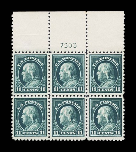 147 ogPB 434 image#434, 11c Dark Green, full top margin plate no. 7505 block of six, crisp and intact, unusually well centered, strong rich color, o.g., stamps n.h., faintly hinged in selvage only, natural paper wrinkle in top left stamp, choice very fine. (Image) $275.00