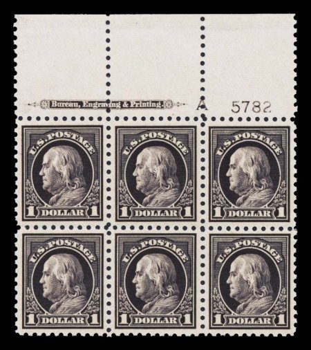 150 ogPB 460 image#460, $1.00 Violet black, a matchless quality full top imprint, letter "A" and plate no. 5782 block of six, being in a condition one would think to be impossible to find on such an important plate block rarity, possessing absolutely flawless centering, with each stamp boasting unusually large margins, its color and impression could not be more prooflike on brilliantly fresh paper, strong and intact perforations all around, especially clean o.g., five stamps n.h., top center stamp lightly hinged, in a word - superb; undeniably the finest existing example of the 1915 One Dollar Violet Black plate block; this incredible plate block was the sole example found in the massive Todd collection and was one of the highlights of his entire holdings; ex-Todd. (Image) $12,500.00