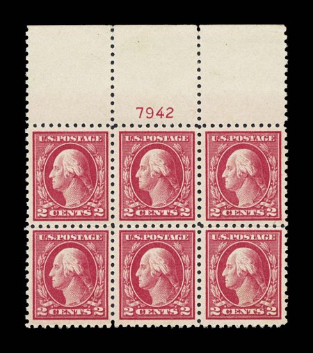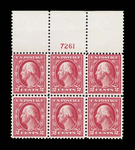 151 nhPB 461 image#461, 2c Pale carmine red, a premium quality full top plate no. 7261 block of six, exceptionally bright and fresh, particularly well centered for this difficult stamp, pristine o.g., n.h., very fine and choice for this; any plate block of this is truly scarce, however a full top plate in this condition is rare indeed. (Image) $2,600.00