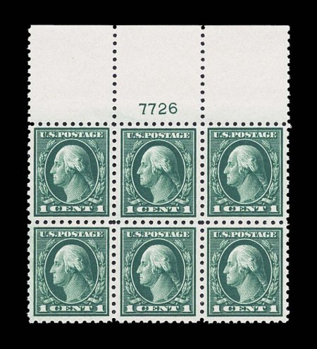 152 nhPB 462 image#462, 1c Green, select full top margin plate no. 7726 block of six, extraordinarily well centered throughout, luxuriously rich color and a crisp prooflike impression, strong and intact, unblemished o.g., n.h., extremely fine gem. (Image) $275.00