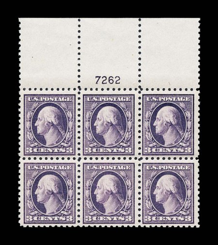 153 nhPB 464 image#464, 3c Violet, an incredibly choice full top margin plate no. 7262 block of six, this being one of the rarest and most difficult of all Washington-Franklin issues to find as a full top plate block, wonderfully fresh and intact, gloriously rich color and a crisp impression on immaculate paper, unusually well centered for this notoriously difficult value, pristine o.g., n.h., very fine and exceedingly choice; neither the Todd nor Wampler collections had a plate block of this in a quality that comes remotely close to the one found here in the Fogelson collection. (Image) $2,250.00