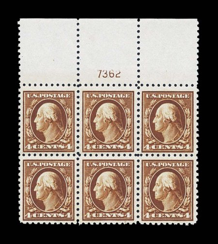 154 nhPB 465 image#465, 4c Orange brown, gem full top margin plate no. 7362 block of six, possessing the finest centering we have ever encountered on a plate block of this value, sumptuously rich color and a strong detailed impression on wonderfully bright paper, crisp and intact, o.g., n.h., tiny natural inclusion in bottom margin of bottom center stamp, extremely fine; clear 1986 PF certificate. (Image) $1,100.00