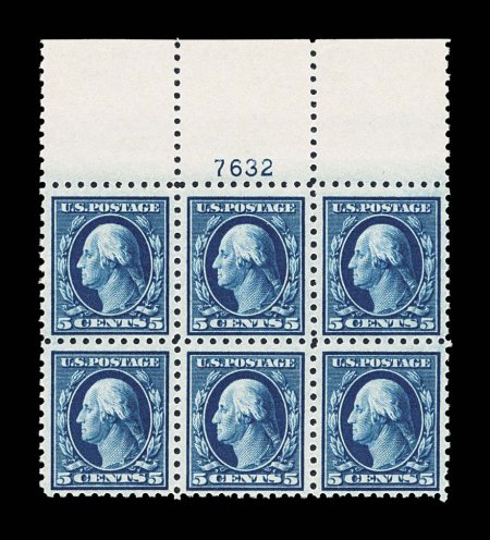 155 nhPB 466 image#466, 5c Blue, pristine full top margin plate no. 7632 block of six, in a true "post office" state of preservation, strong and intact, strikingly intense color and impression, well centered, unblemished o.g., n.h., very fine and quite choice; one of the few premium quality full top examples of this scarce plate we have ever seen offered at auction; 2001 PF certificate. (Image) $1,600.00