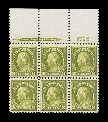 159 ogPB 470 image#470, 8c Olive green, full top margin imprint, letter "A" and plate no. 5725 block of six, particularly well centered, sumptuously rich color, o.g., five stamps n.h., bottom center stamp (and ungummed portion of sheet selvage) lightly hinged, very fine; a seldom encountered plate block as a full top. (Image) $550.00