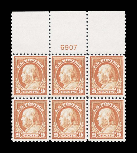 144 nhPB 432 image#432, 9c Salmon red, pristine full top margin plate no. 6915 block of six, extraordinarily fresh, crisp and intact, gorgeous intense color and impression, wonderfully well centered, unblemished o.g. without a single gum bend or skip, n.h., extremely fine; we have never encountered a finer quality example of this scarce plate block, especially being a full top. (Image) $1,150.00