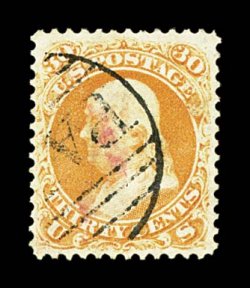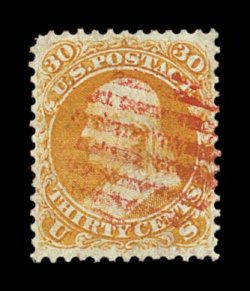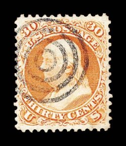 212 O 71 image#71, 30c Orange, gem used single, flawlessly centered within considerably larger margins than typically associated with this value, lovely color that is wonderfully bright, plus an unusually sharp impression, fully intact perforations all around, neat portion of large Boston "Paid" cancel and trace of a red cancel, extremely fine with great eye appeal; 1991 PSE and 1997 PF certificates. (Image) $190.00