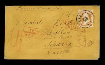 215 c 71 image#71, 30c Orange, an especially choice single which possesses outstanding centering and margins for this notoriously tightly margined stamp, wonderfully tied to orange colored 1865 cover to Switzerland by socked-on-the-nose "Shakopee, Min./Jun 24" c.d.s., stamp also tied by red boxed "Aachen/Franco" handstamp, sent via "Prussian Closed Mail", numerous transit and arrival postmarks, very fine; a handsome Thirty Cent 1861 cover in much nicer condition than typically encountered. (Image) Est. 300-400