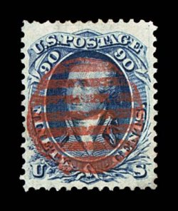 216 O 72 image#72, 90c Blue, an absolutely stunning used example that possesses tremendous overall eye appeal, being wonderfully well centered within large margins, deep luxuriant color in an especially deep shade, sharp detailed impression on particularly bright paper, all wonderfully complemented by a striking "socked-on-the-nose" circular grid cancel in red, extremely fine; a more colorful example could not be found; 2005 PF certificate. (Image) $490.00