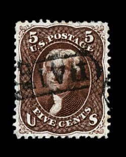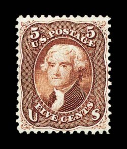 222 O 75 image#75, 5c Red brown, incredibly well centered and margined for this always difficult stamp, possessing particularly intense deep color and a sharp impression on bright paper, central boxed "Paid" cancel, extremely fine; a difficult stamp in this unusually choice condition; 2003 PSE certificate. (Image) $525.00
