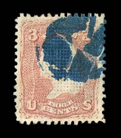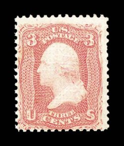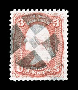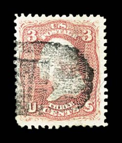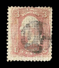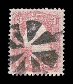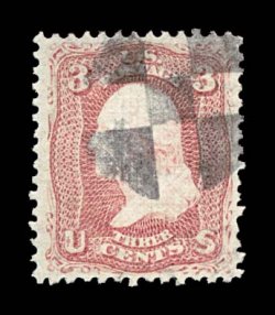 228 O 79 image#79, 3c Rose, "A" grill, used, being among the very few existing copies of this notoriously difficult stamp that is both completely free of flaws so often seen on this, as well as having fully intact perforations which is next to impossible to find, additionally this is one of only a handful that exist with a fancy cancellation, in this case being a nice strike of a negative "U.S." cancel, very fine overall; 2004 PF certificate. (Image) $1,350.00